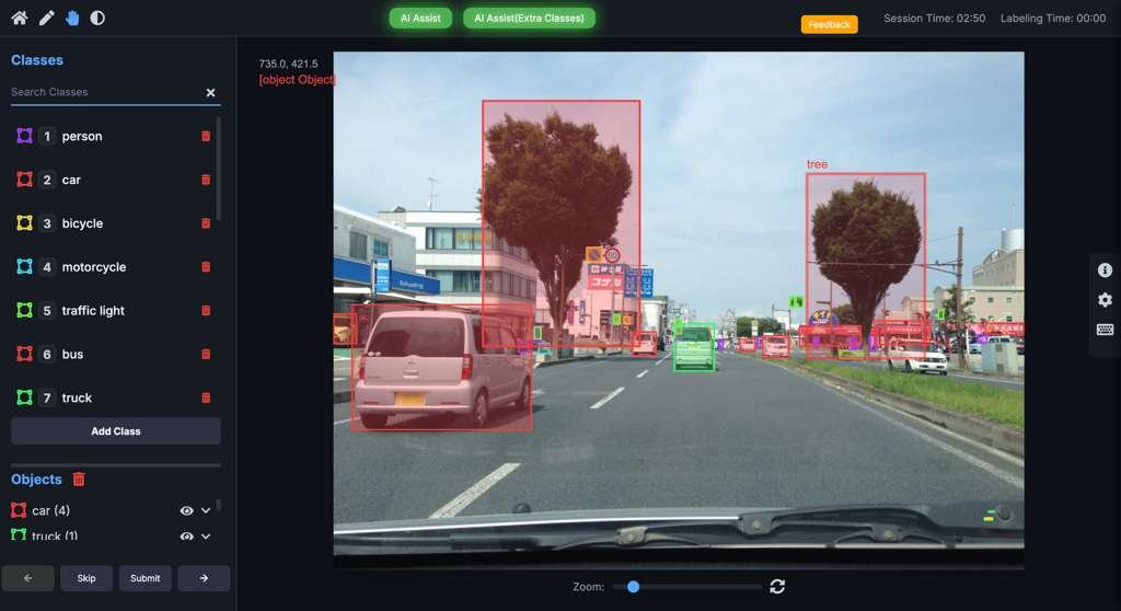 AI-Assist tools pre-label objects, speeding up repetitive tasks.