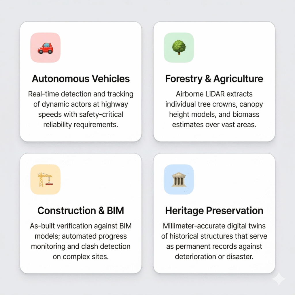 Light Detection and Ranging (LiDAR) sensors fire millions of laser pulses per second, recording the precise 3D coordinates of every surface they strike. The result is a point cloud — a dense constellation of (x, y, z) coordinates that faithfully captures the geometry of the physical world.